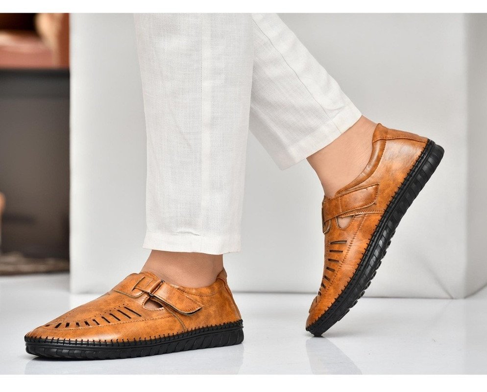 Men’s Faux Leather Sandal, ? Color: Tan, ? Material: Faux Leather, ? : 6, ? Closure Type: Slip-On, ? Heel Type: Flat, ? Type: Sandal, ? Disclaimer: The color of actual product may vary slightly from the images provided due to photographic lighting conditions and difference in screen resolutions.