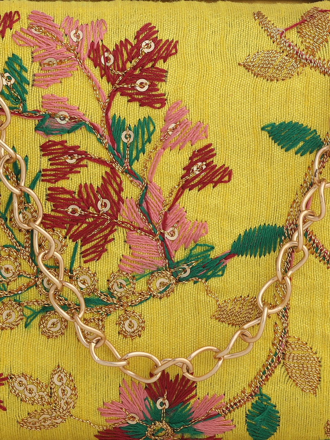 Yellow & Pink Embroidered Box clutches, Has gold chain shoulder strap, 1 main compartment with twist closure